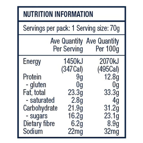 Produced in a facility that handles sesame seeds, peanuts and other tree nuts. We take care to minimise cross-contact, but we cannot guarantee the absence of allergens. If you have any questions or concerns about allergens, please feel free to contact us.
