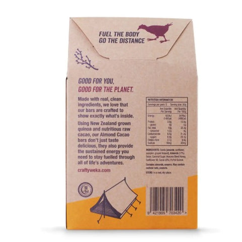 Almond Cacao: Almonds, Brown Rice Syrup, Dates, Organic Cacao Powder, Sunflower Seeds, Pumpkin Seeds, Coconut, Sea Salt.