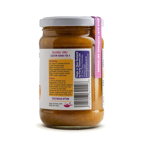 Forty Thieves Cashew Korma Curry Paste is a smooth, gently spiced base made with 37% dry-roasted cashews, coconut milk, and aromatic Indian spices. Naturally creamy with a mellow warmth, it’s ideal for quick, family-friendly curries and versatile enough for slow cookers, marinades, and sauces. With a rich texture and balanced flavour, this pantry staple brings effortless depth to vegetables, legumes, or your preferred protein—perfect for wholefoods NZ kitchens seeking convenient, quality organic pantry staples without added sugar.