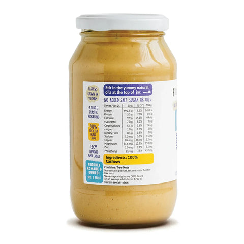 Forty Thieves Cashew Butter is a smooth, naturally sweet spread made from 100% dry-roasted cashews and nothing else. Handcrafted in New Zealand, it delivers a rich, velvety texture and mild flavour that’s perfect for spreading, blending, or baking. Packed with plant-based protein, healthy fats, and magnesium, this wholesome nut butter is ideal for wholefoods NZ kitchens and refined sugar free lifestyles. The jumbo 500g glass jar means more of the good stuff to enjoy, for longer.